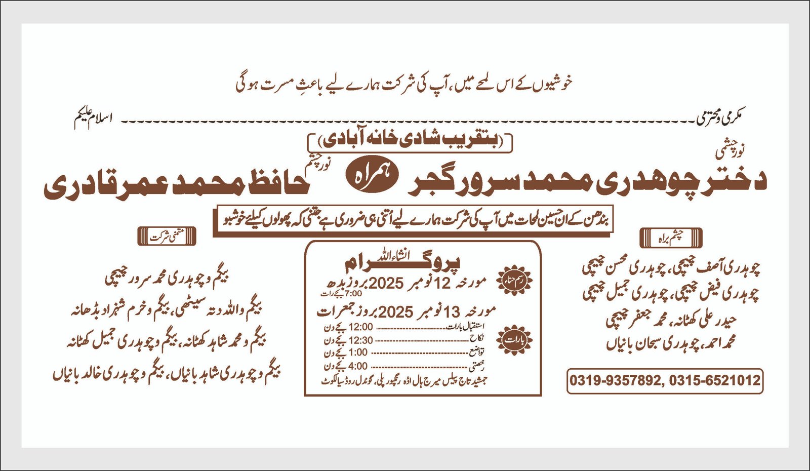 - Pure Urdu text β bride ka naam, walidain ke naam, mehmaanon ko izzat ke sath dawat